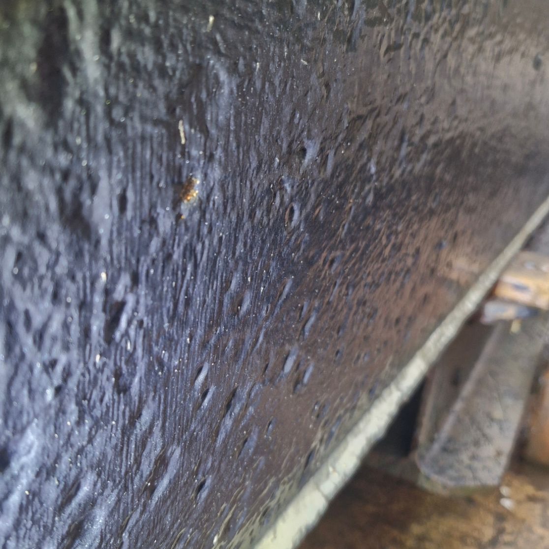 In this particular case, that's exactly what happened. The bitumen looked smooth and uniform at first glance, but under the torch beam, we could see faint depressions in several areas along the waterline. These weren't impact dents or cosmetic blemishes: they were the telltale signs of underlying corrosion.